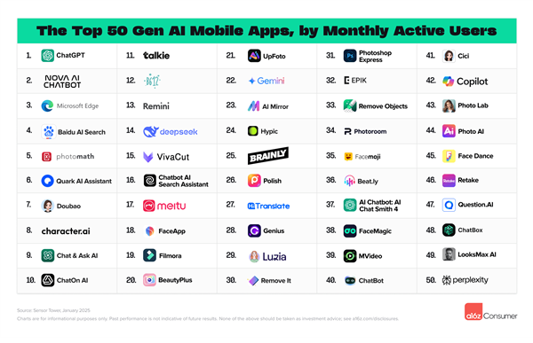 据领会。此外按照2025年1月数据,其挪动端产物于1月25日推出,9%来自美国,全球出名投资基金、征询公司Andreessen Horowitz(a16z)发布了最新的生成式AI消费级使用排行榜。